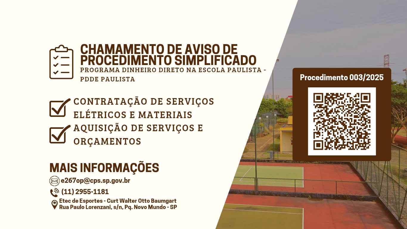 A Etec de Esportes Curt Walter Otto Baumgart informa que estão abertas as inscrições para participação no processo de concorrência para prestação de serviços de substituição da iluminação externa e interna da unidade, com recursos do Programa Dinheiro Direto na Escola Paulista – PDDE Paulista .